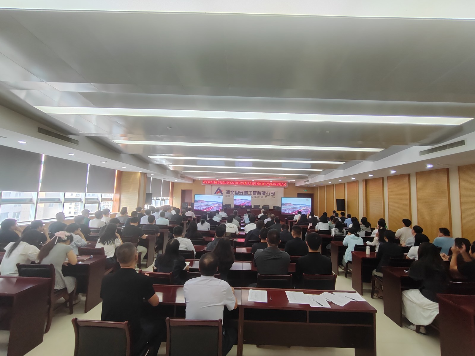 2025年9月3日,為紀(jì)念中國人民抗日戰(zhàn)爭暨世界反法西斯戰(zhàn)爭勝利80周年,河北省安裝工程有限公司積極組織職工集中觀看閱兵盛況直播。公司機(jī)關(guān)及各分公司、項目部共計2000余人通過多種方式同步參與,共同回顧歷史、緬懷先烈、展望未來。上午9時,習(xí)近平總書記發(fā)表重要講話,9時19分大閱兵正式開始,公司機(jī)關(guān)及各分公司、項目部會議室座無虛席,職工們們整齊地坐在屏幕前,神情莊重地注視著電視畫面。在閱兵式過程中,